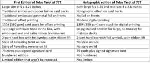 This is the same art and size as the first edition Telos of 777. The backs are a new holographic design. The deck is same size as the large Tabula Mundi. See the remastered color of this new edition. These cards have holographic crystal backs. We have printed this on the same card stock as the Tabula Mundi. It has smooth slice-cut edges and rounded corners. This item comes in a two-part hard case with a foil symbol and satin ribbon lining. The box also contains a signed title card, but is not numbered. It has a 60 page booklet. However, it can also be ordered to ship with the new 594-page Scions of 777 book..